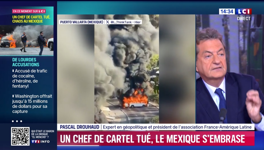 Invité du journaliste Thomas Misrachi, Pascal Drouhaud, Président de LATFRAN, a tenté d’expliquer la vague de violence qui s’est abattue sur le Mexique depuis le dimanche 22 février, date à laquelle le chef du cartel de Jalisco Nouvelle génération (CJNG) – Nemesio Oseguera Cervantes, alias « El Mencho » – a été tué par l’armée mexicaine lors de sa tentative d’arrestation. Sa tête était mise à prix pour 15 millions de dollars.  L’annonce de la mort du baron de la drogue a provoqué des représailles de la part de ses partisans dans 20 des 32 États fédérés du Mexique, notamment dans des lieux touristiques.