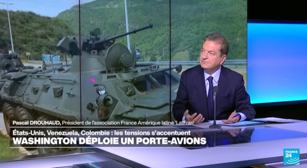 Pascal Drouhaud, Président de LATFRAN (latfran.org), était l’invité sur France 24, le 25 octobre 2025, de la journaliste N’daricaling Loppy  dans l’émission « Autour du monde » pour commenter la hausse des tensions en mer des Caraïbes entre le Venezuela et les Etats-Unis, mais aussi avec la Colombie. Washington a décidé de déployer un porte-avions en appui de ses opérations présentées comme une lutte contre le narcotrafic en Amérique latine, une montée en puissance considérable des moyens militaires américains dans la région.