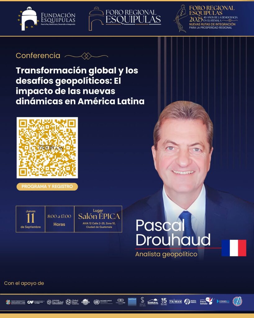 Pascal Drouhaud a été invité à s’exprimer lors du Forum régional 2025 de la Fondation Espulas, au Guatemala le 11 septembre 2025. La Fondation œuvre à la construction « d’une région pacifique, sûre, démocratique et équitable, source de bien-être pour ses populations » : elle souhaite « contribuer à l’édification d’une Amérique centrale développée et intégrée, maîtresse de son destin ».